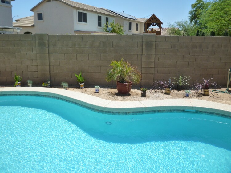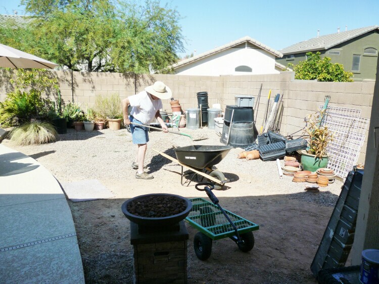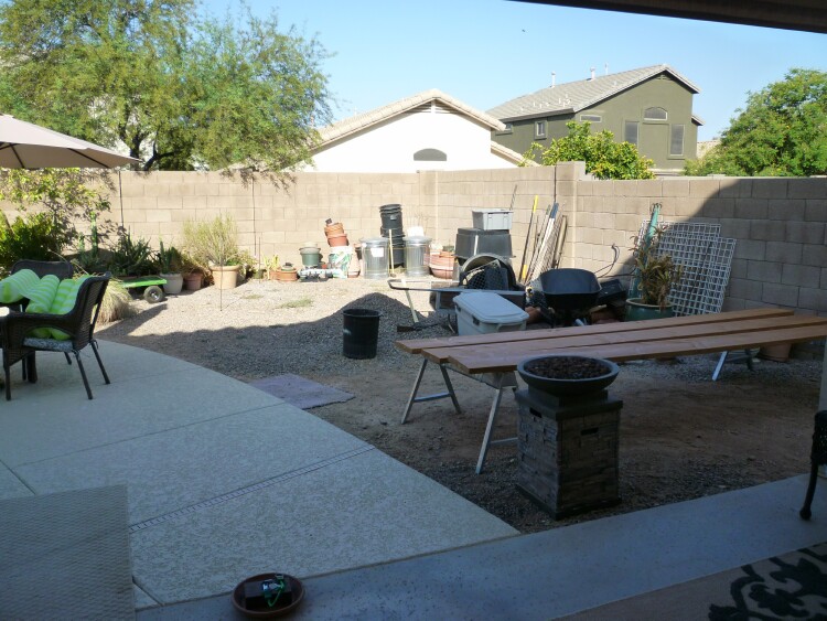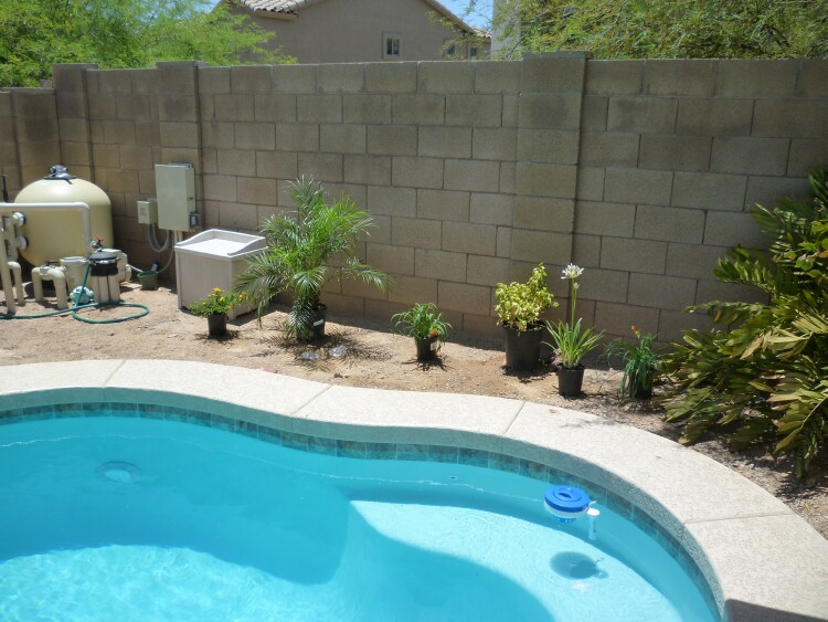 Since the temps have cooled down a little (108°) – our landscaper is coming this week to put in all the water lines for drip irrigation and adding more hose bibs in the back.  He is also putting in the lines and transformers for lighting so we can highlight some plants in the yard and around the pool.  Hubby is cleaning up this area so he and the landscaper can plot out their design plans.