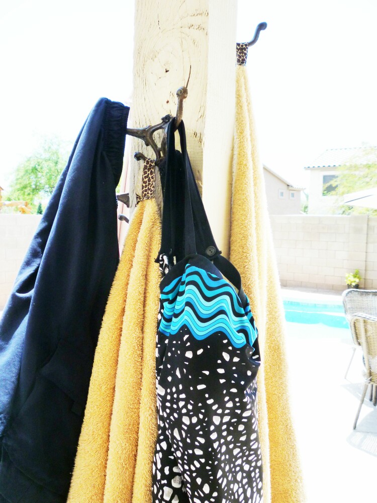 I needed to find a spot by the pool so you could grab a towel when you get out and then have a place to come back out and hang it up to dry with your suit when you change clothes.  The patio post seemed like the perfect spot.   I found some really cute hooks at Hobby Lobby and Jim just screwed them to the post.  Plenty of room to hang a lot of towels and suits.  Each hook has 4 arms so room for 12 articles without doubling up..