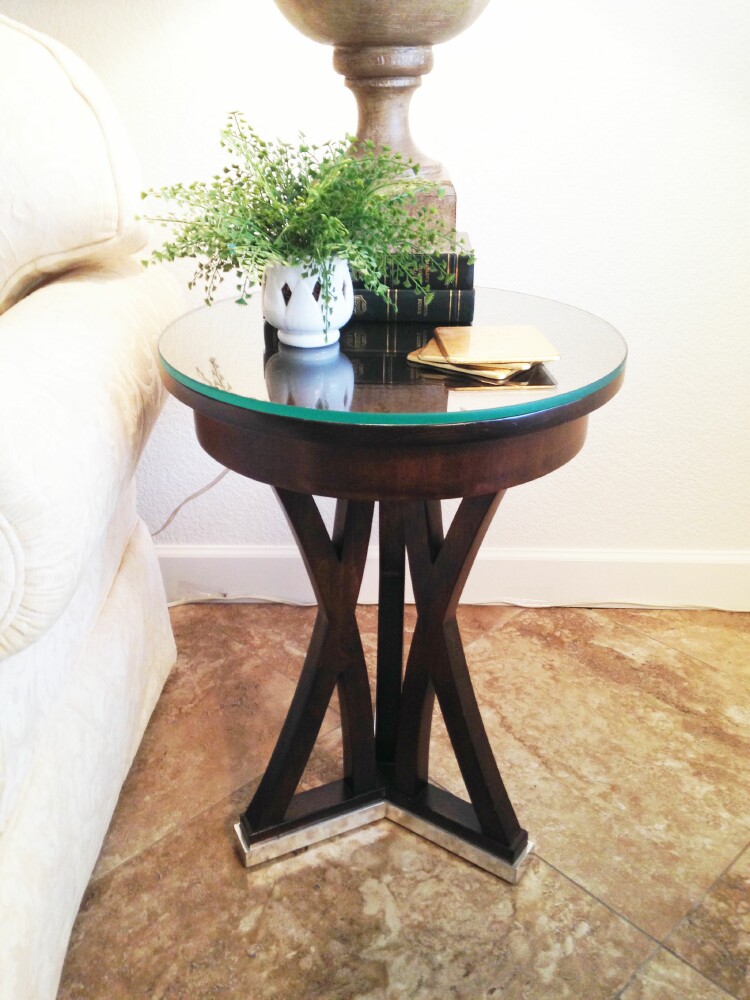 I needed a small table to replace the floor lamp and I found a jewel. This came from one of my favorite haunts – Hotel Liquidators. It is gorgeous – 3 x legs, great size, heavy glass for top and silver metal on the feet. Best of all only $49.00.