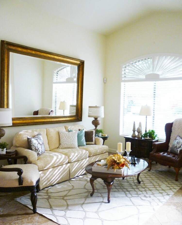 The one thing in common you all suggested was to add some drapes and find a rug. I agree about both of these. So I am going to find or probably make drapes since I need some really, really long ones. I am now trying to figure out the rod situation. I think I want them hung high above the arch of the window, so not sure about rod – maybe white or lucite – not sure. I will make a decision about the mirror after the drapes are up. I did find the rug I love and the larger size just came and it looks awesome. Just enough pattern to be fun.
