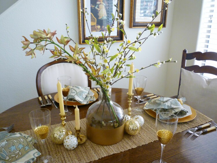 Instead of using two large candlesticks, I used three small ones and added some of the glitter balls I had on the table for the dinner party. (You can see that table setting here.) I didn’t want this setting to be as fancy as before or at the party, so I went for casual with a little glitz.