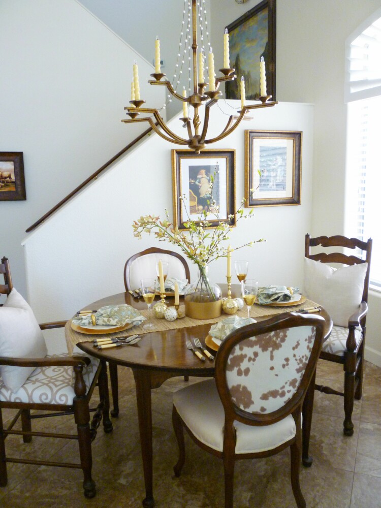 After all the aftermath was cleaned up, dishes done, house vacuumed and mopped, it was time to put the tables back together. I had added two leaves to the dining room table so I could seat seven there. (We had 15 in all, so I had 8 at the breakfast table too) I put the table back to a small round and decided to do a little bit different tablescape.