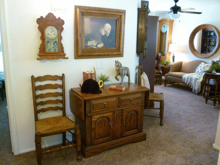 I love this painting of the “Old Man Praying”.  It is one of my favorite things, so finding a home for it has been a must, however that has been a challenge.  I have tried it on several walls in the kitchen and the breakfast area and they are just barely wide enough for the painting to hang on them.  It really didn’t look very good.  As much as I wanted to have him in my breakfast area, it just didn’t work.  When I was rearranging things up here, I moved a couple of the clocks and found that he looks perfect above the buffet.  (Now a buffet doesn’t normally go in the landing either but I love this piece too so it needed to find a home.)