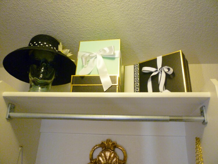 The top shelf has my “Audry Hepburn” hat and some pretty storage boxes.