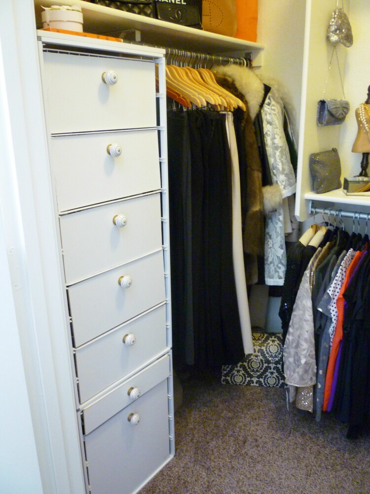 This side also has my wonderful wire drawers that hubby madeover for me in my closet makeover in the last house. These are just those wire stackable units from the Container Store. They are perfect to hold all of my under garments, scarves and etc.