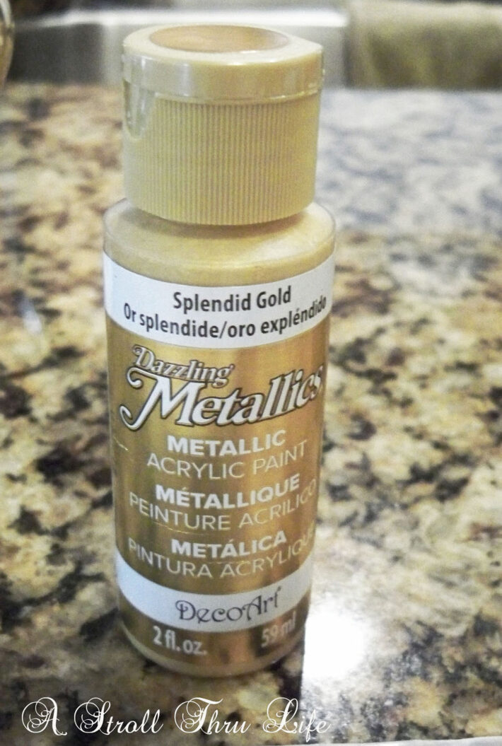 I started with some simple white plastic pumpkins. Then I took a small brush and painted the stems gold and streaked gold down the sides of the pumpkins.