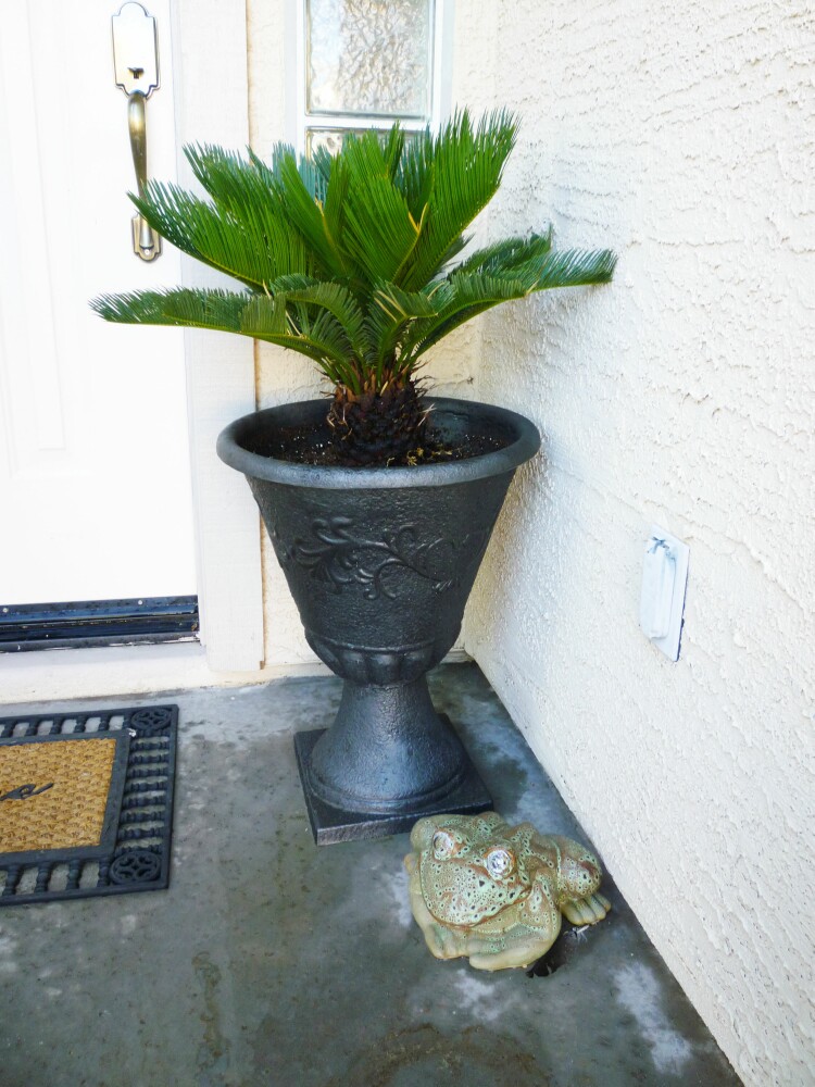 I spray painted an old urn that I had and added a pretty palm. This adds a little greenery at the door and that frog is one of my favorites. I’ve had him for a long time.