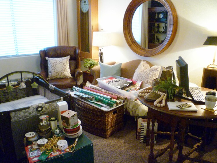 I had a wrapping station set up in the landing upstairs, but hubby needed the work table I was using, so all of that has shifted to the loft. My desk and the grands crib along with the paper and ribbon creates quite the mess.