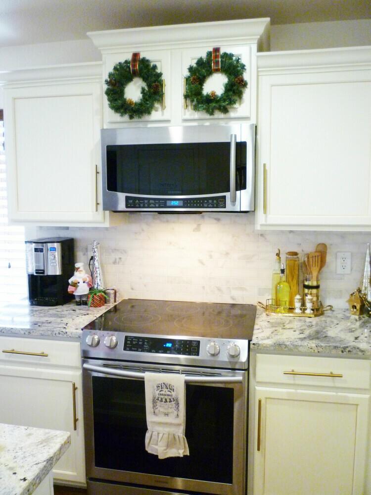 I am hosting several parties this season so I kept the decor really simple. I need room to cook up a storm. Simple wreaths hang from plaid ribbons above the range.