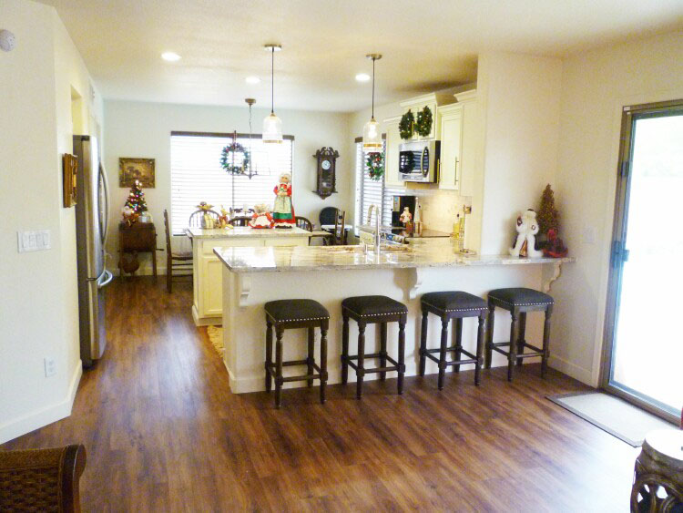 Huge transformation don’t you agree. The back of the house is where we “live”. The breakfast area, kitchen and family rooms run across the entire back of the house. This is my view standing beside the coffee table in the family room. When we have all the family over, everyone seems to hang out in these spaces. The long breakfast bar is often turned into one big buffet counter.
