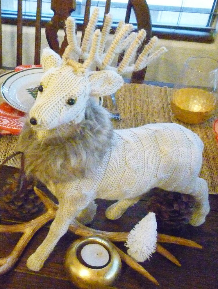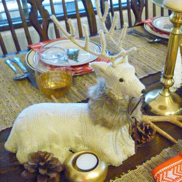 Christmas plates and napkins from Goodwill and fun sweater reindeer from Home Goods.