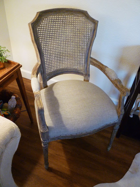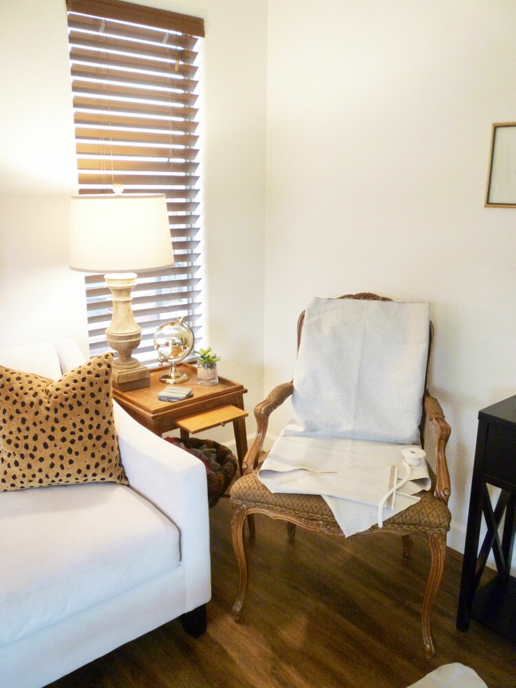 I tried several different fabric samples for this chair, and it was hard to find something that had some texture or pattern that would go with the sofa and not clash. Whites are so tricky. Then I tried a remnant piece of fabric I had and I think it is perfect. It is a small pattern that is greige. Depending how you look at it, it is either a soft beige or gray. It looks perfect with the sofa.