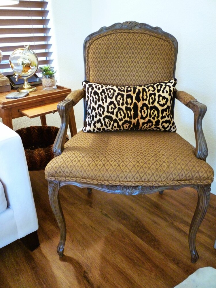 The gray softened the brown and the camel made it look like wood. The final coat was clear satin poly. I am not sure that this will be the final take on this chair, but for now the color of the fabric works and I do like the wood finish better on the frame. So for now it stays.