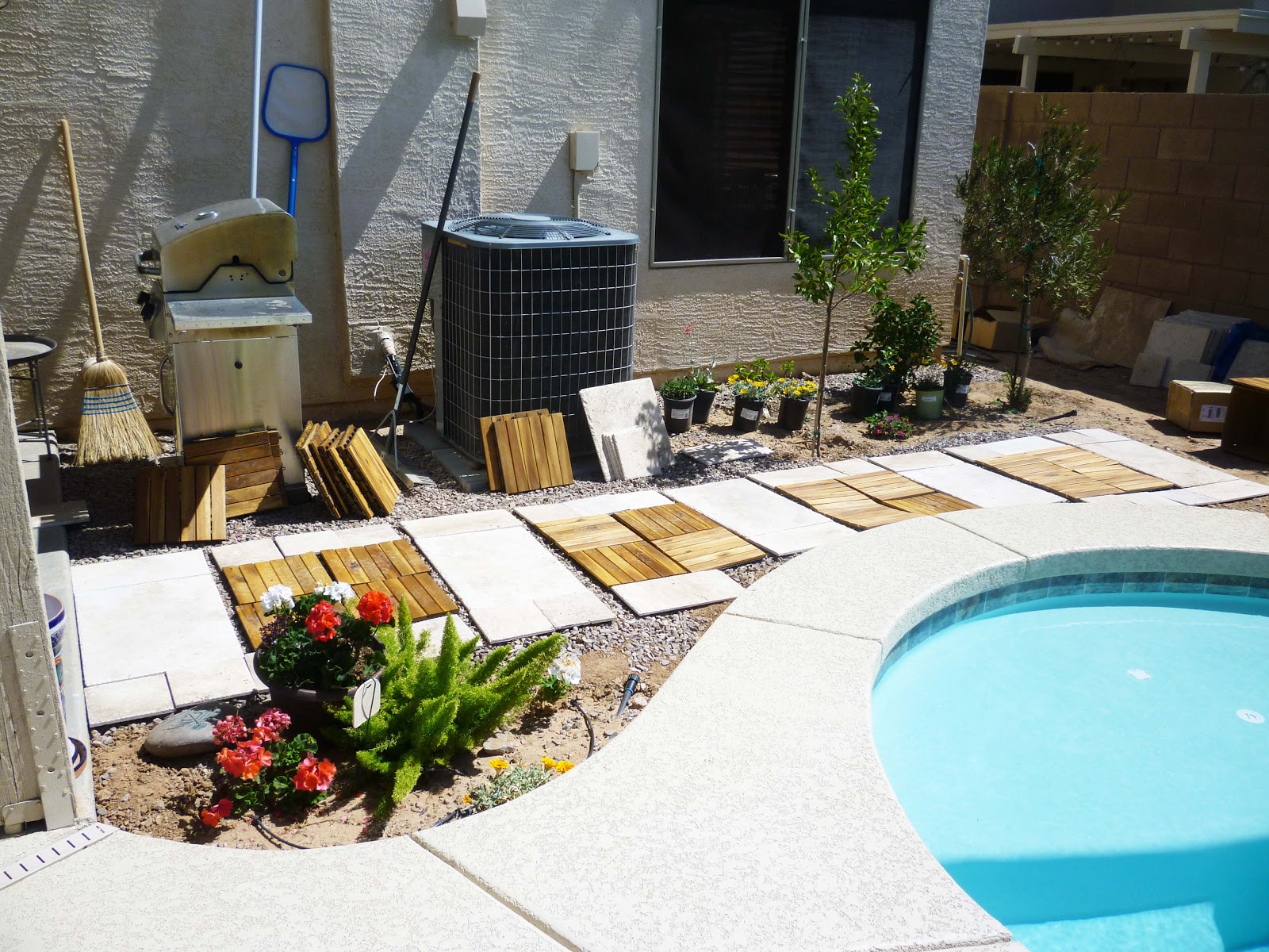 This just might work and give this area some character. We can carry this all the way over to the wall by that end of the landscaping. Also since we will have a wood fence around the air conditioner to camouflage it and muffle some of the noise, the wood tiles tie in beautifully.