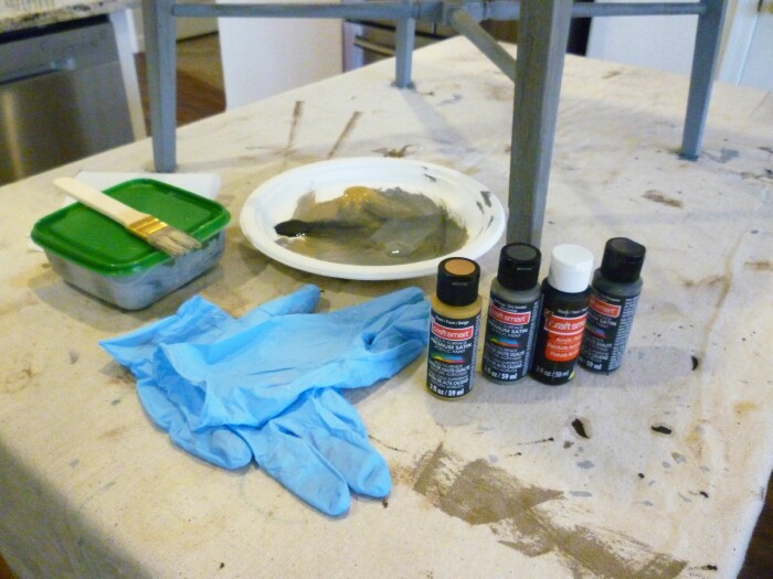 Now it needed some distressing, so I mixed up some different paints, brown, gray and black on a plate and did some dry brushing.