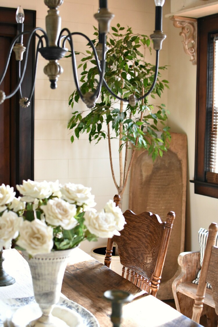 tablescape and left a simple centerpiece of faux roses in a shabby urn on top