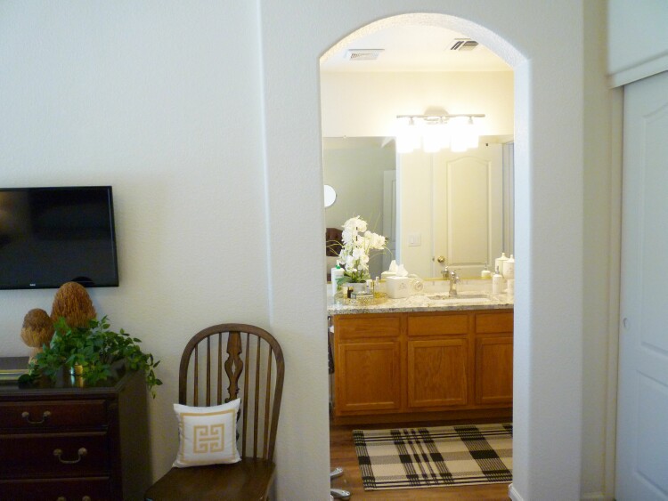 Our Master Bathroom is one of the compromises we made with this house.  It is by no means big and roomy.  It is a narrow galley type bathroom with the tub and vanity in one section then the toilet and shower in another section.  The shower is roomy since it spans the full 5 1/2 feet, but that means the whole bathroom is slim.  Getting a good picture is really a challenge.