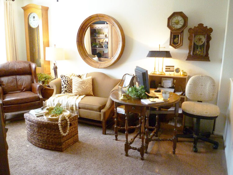 The entertainment center sits across from the settee, chair, and desk. It gives me ample storage for all my office needs and a place to play with all my favorite accessories too.