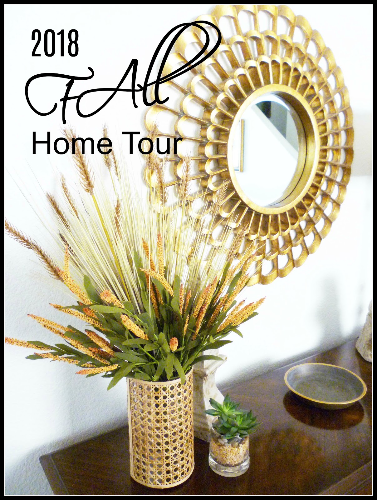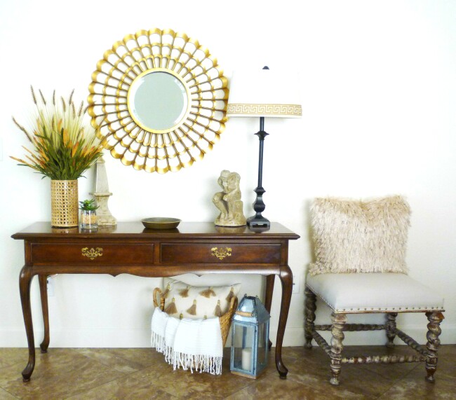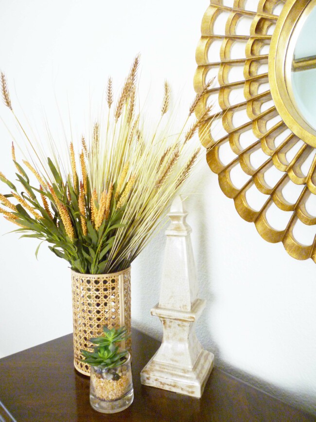 This area recently got a makeover. I replaced a painting with this mirror and added some new fall accessories. I love grasses and these had such pretty fall colors. I love the pretty wicker vase I found at Home Goods too. I am loving adding in a little wicker throughout the house this season.