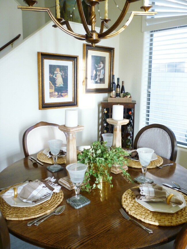 Just a sinple pot of ivy and two candlesticks is all it takes to create an inviting and interesting table.