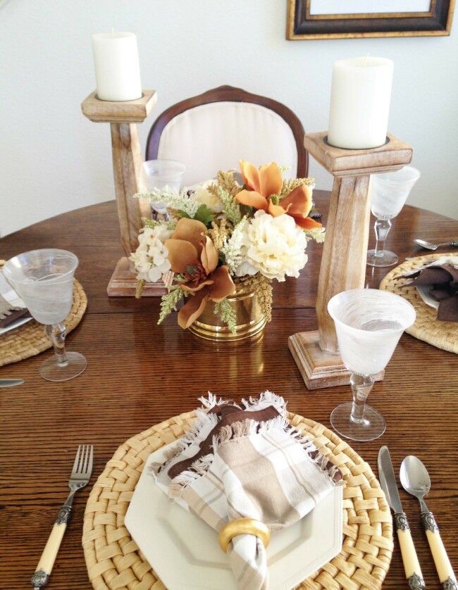 I am using wicker placemats to tie in with the wicker baskets in the living room. The floral centerpiece is made up of assorted flowers from my stash. The tall weathered wood candlesticks are the star of the show.