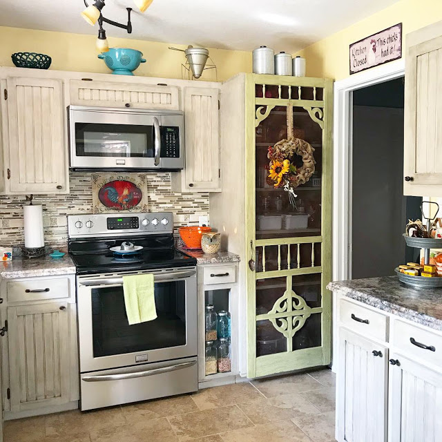 Love this kitchen from Clover House. Check out her tutorial for that wonderful Dollar Tree Wreath on the door.