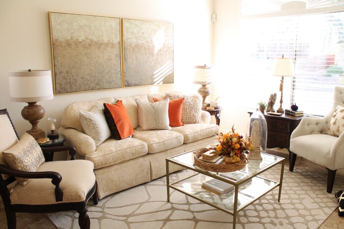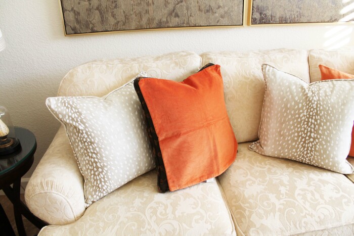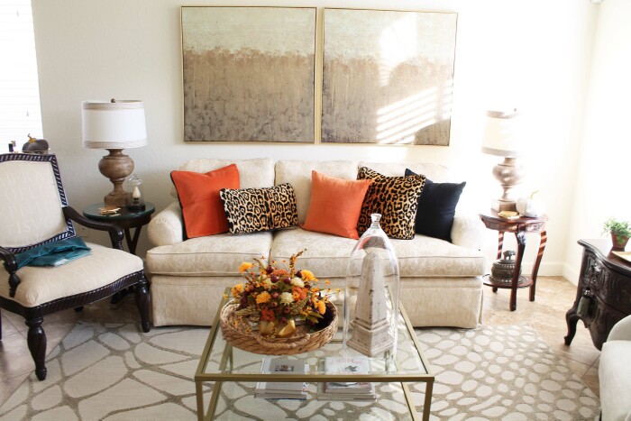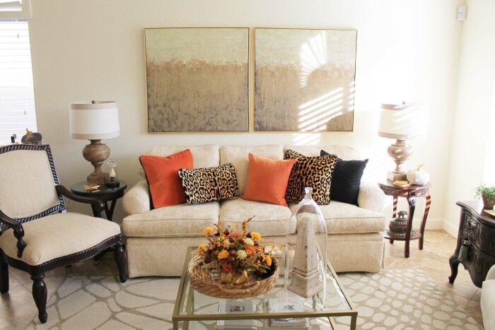 I think I like the idea of just the orange for fall and keeping the antelope pillows to go with it. The floral arrangement on the coffee table adds more orange around the space.
