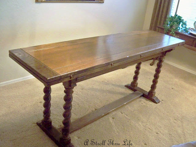 The top slides over and folds in half so it can become a library table. Isn’t that amazing. I love this. (This picture was taken a while back in our previous dining room)