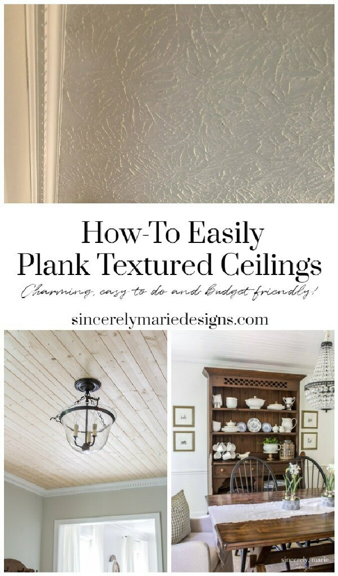 If you have a ceiling with tons of texture or popcorn, then this could be your answer.  I love the look of planked ceilings and this step by step tutorial is perfect.