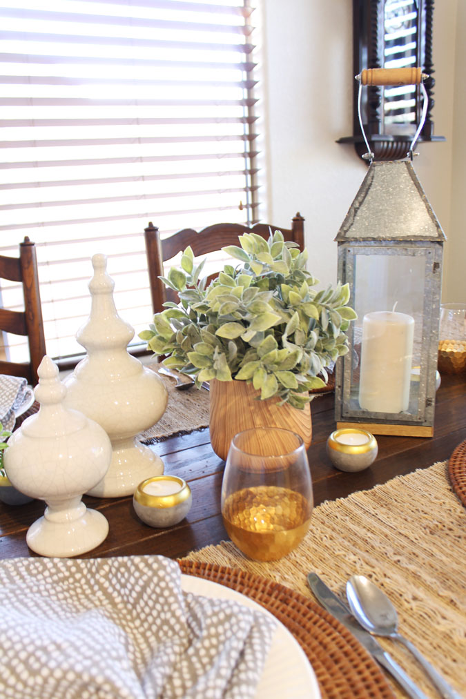 The breakfast table shares fall with some simple greenery and the warm glow of a candle.
