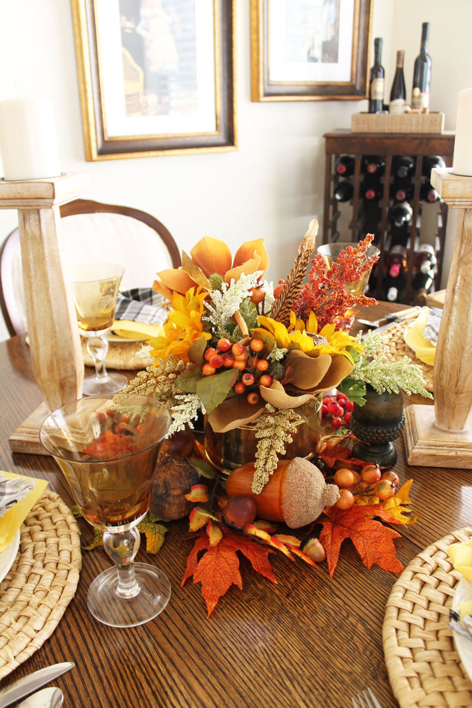 The dining room has another pretty floral centerpiece. The golds and oranges bring Fall to the table with simple flowers, berries and leaves.