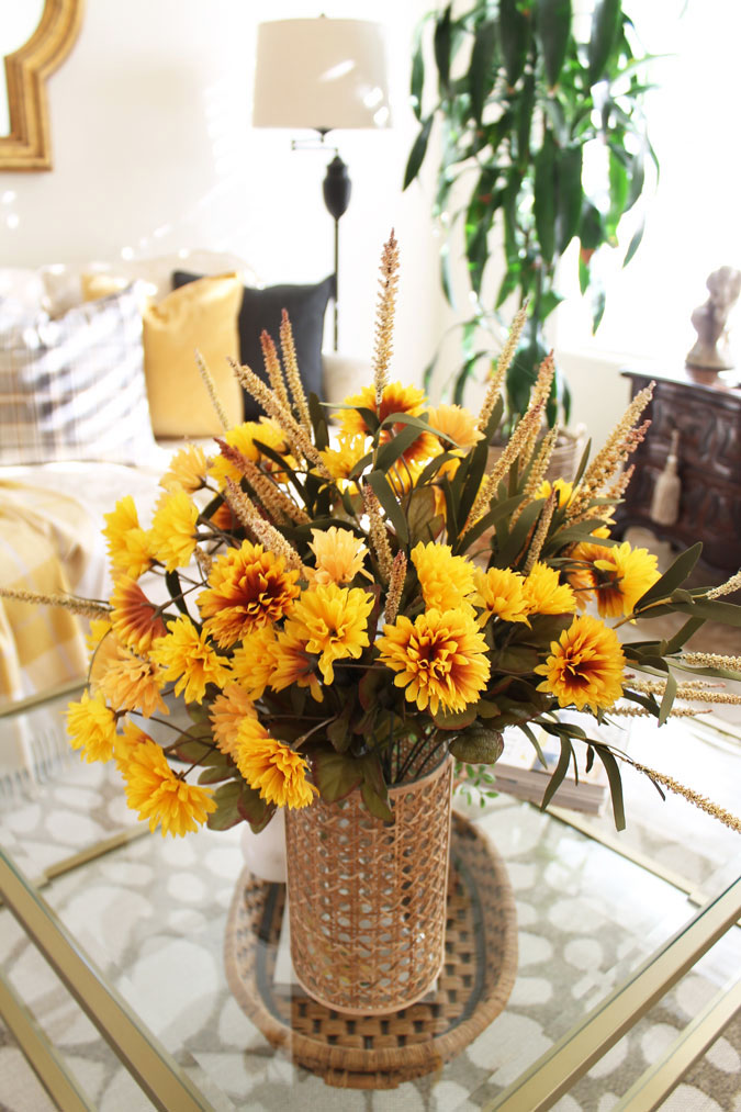 For Fall I am using some warm golds, oranges, and greens. They create the feel I am looking for in every room. I love the pretty golds in this bouquet for the living room.