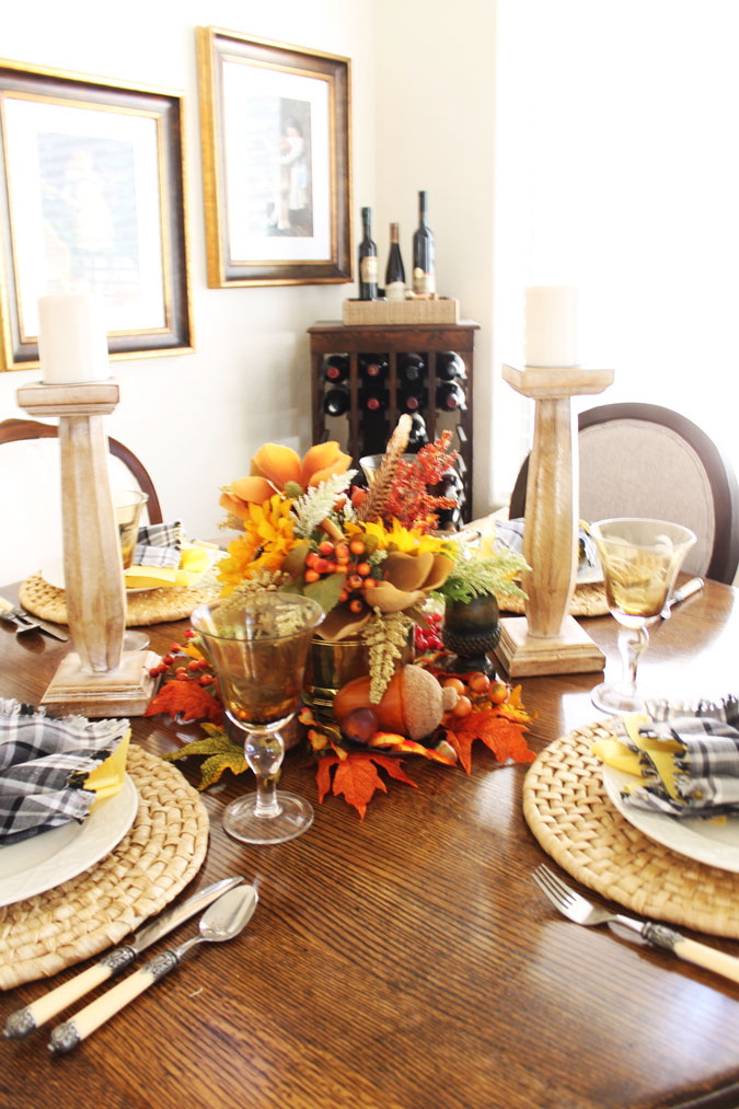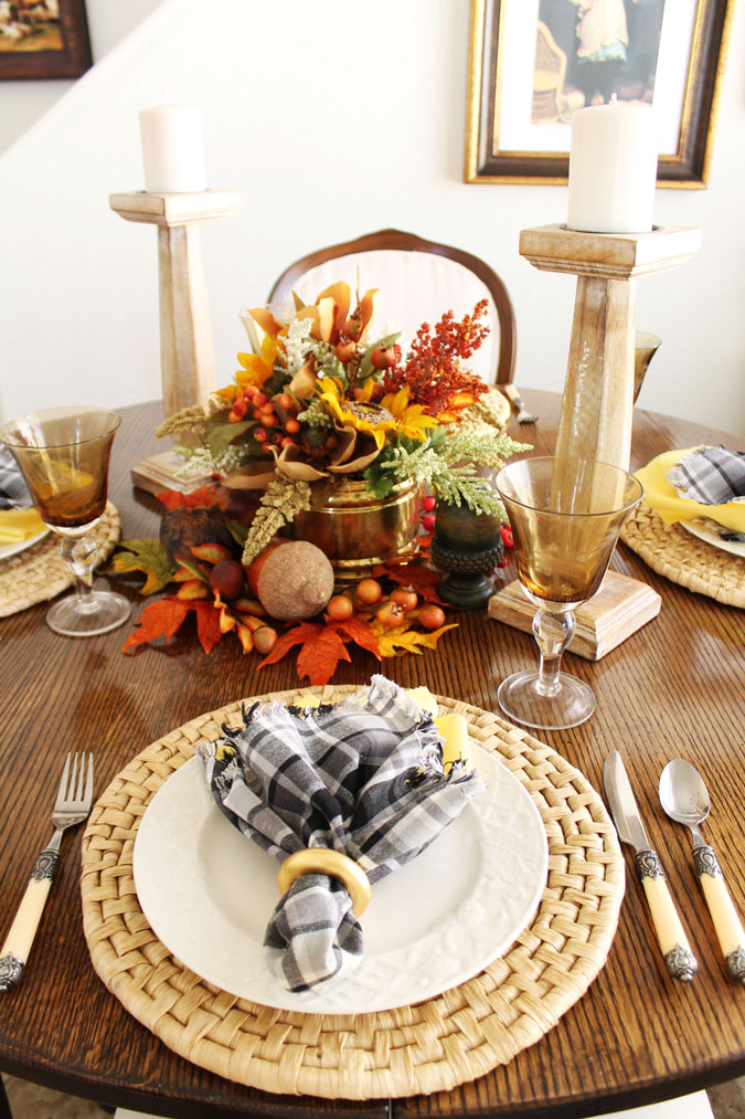 The table is set with rattan placemats, gray plaid napkins and pretty autumn florals.