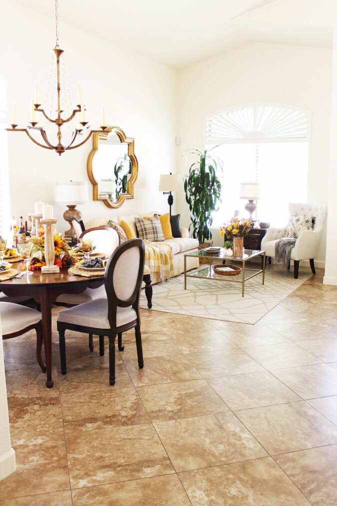 Let’s start in the Living Room and Dining Area – those are the rooms you walk into from the front door. I love all the colors of fall, especially all the warm oranges, golds and pretty greens. I chose to use Mustard Gold as my accent color in here this year. Such a fun happy color and mixed with grays and beiges, it creates a warm and sunny pallet.