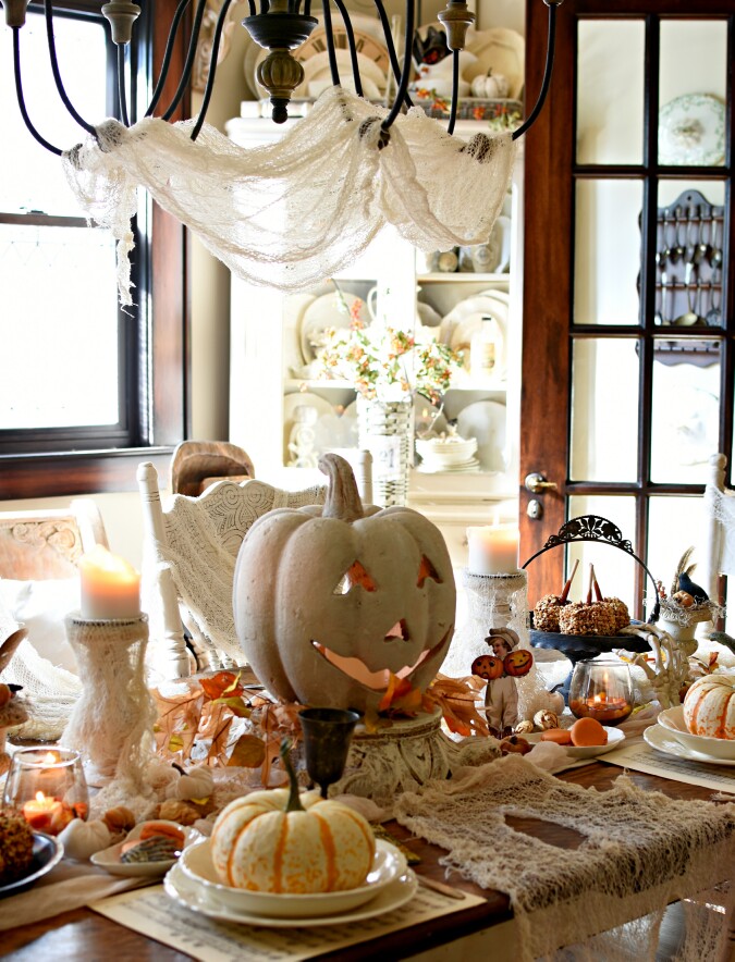 I am definitely into Happy Halloween Jack-O-Lanterns – – – – not scary.  Love this one, such great detail on the entire table.
