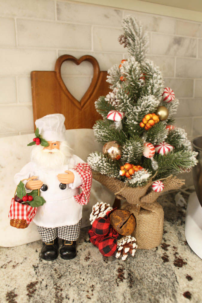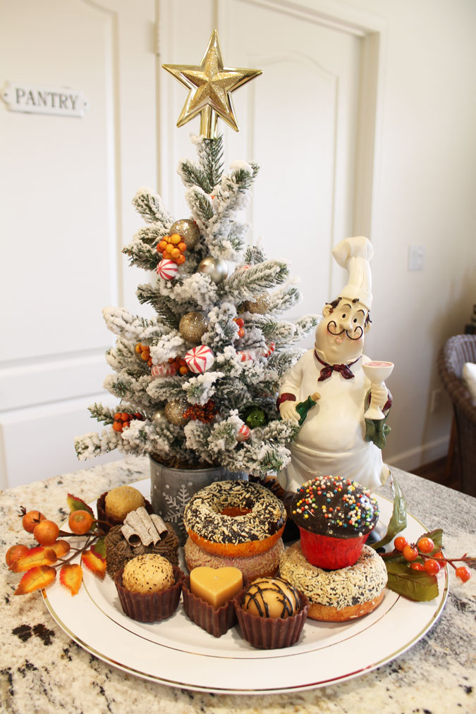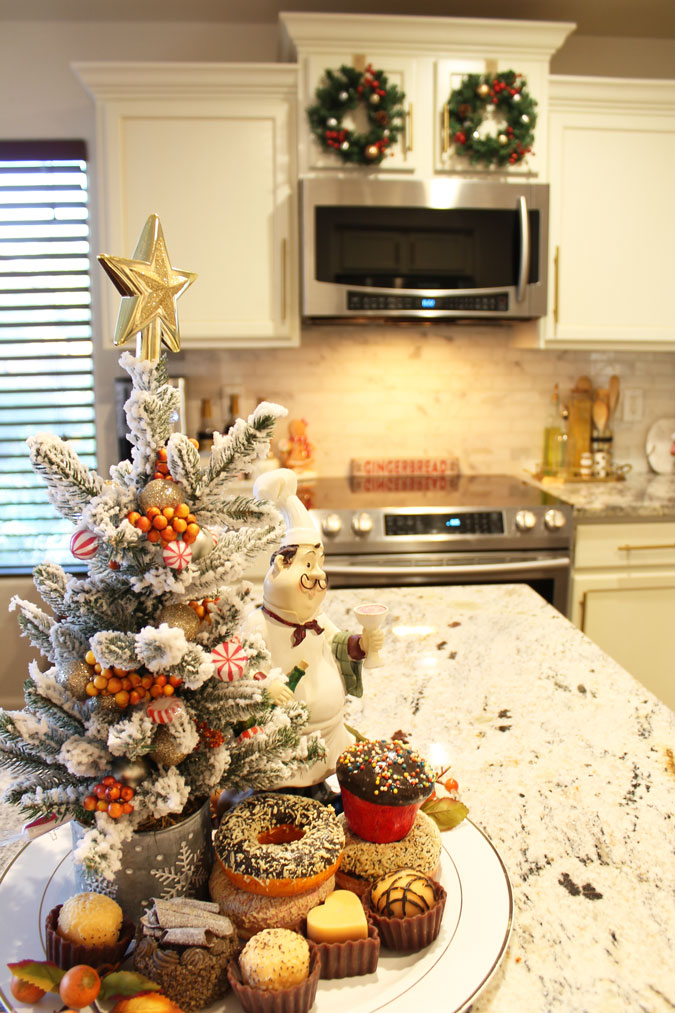 The island has my favorite little drunk chef showing off all of his latest treats. He always enjoys a little too much champagne when he’s cooking, but I love him and his goofy grin. A tiny frosted tree filled with lots of peppermint candy looks so tasty too.