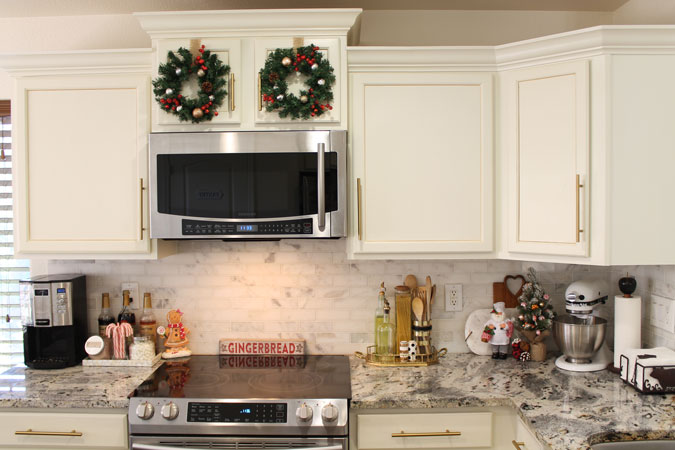 My favorite room in the house – my kitchen. I cook a lot and we entertain a lot, so decorating this area is something I love to do. Switching all the decor out for Christmas is especially fun. Welcome to my Christmas in the kitchen.