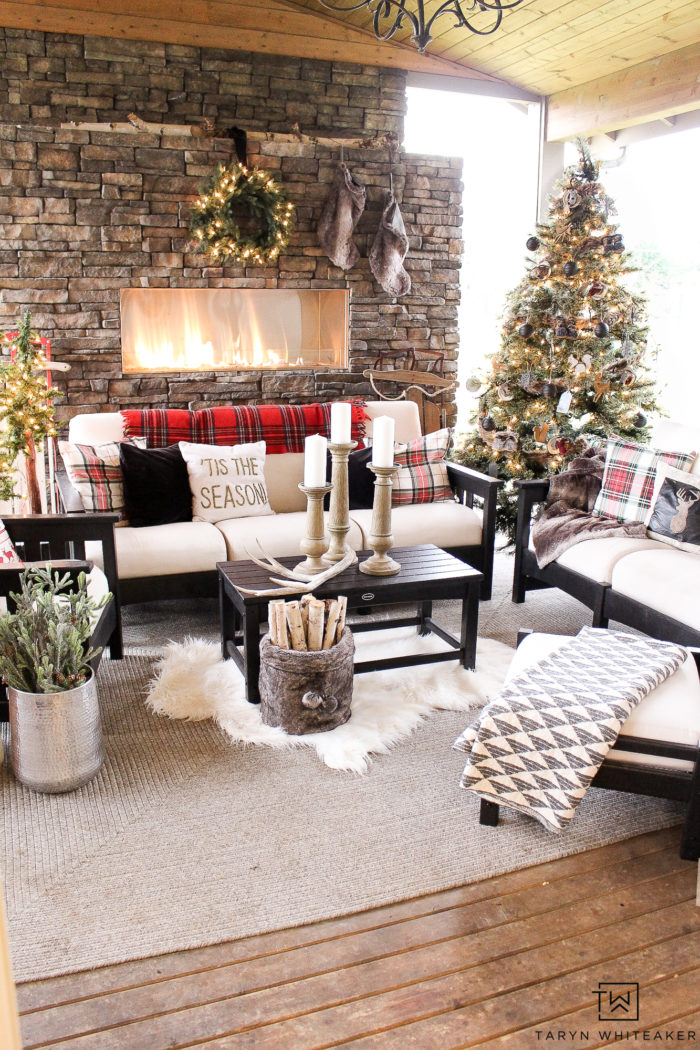 This outdoor patio area is stunning and she has it decorated like a rustic cabin for the holidays. Love it all.