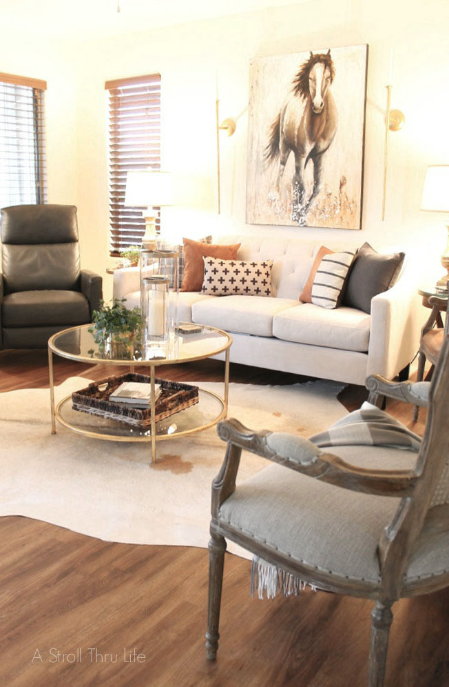 Winter Family Room Update in soft earth tones with leather and cowhide rug. A horse painting takes center stage to pull the room together.