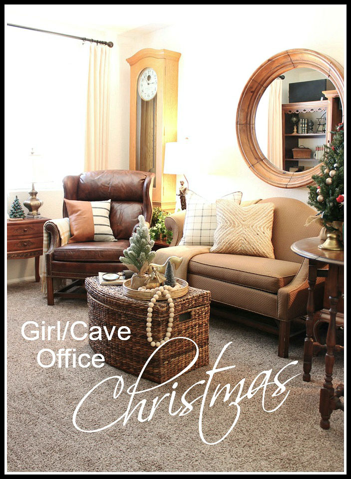 This exact same area at Christmas was still really neutral, but by adding a leather and linen pillow, plus a straw pillow we have more texture. Then the plaid pillow increases the pattern with the plaid throw on the chair arm. Girl/Cave Office Christmas