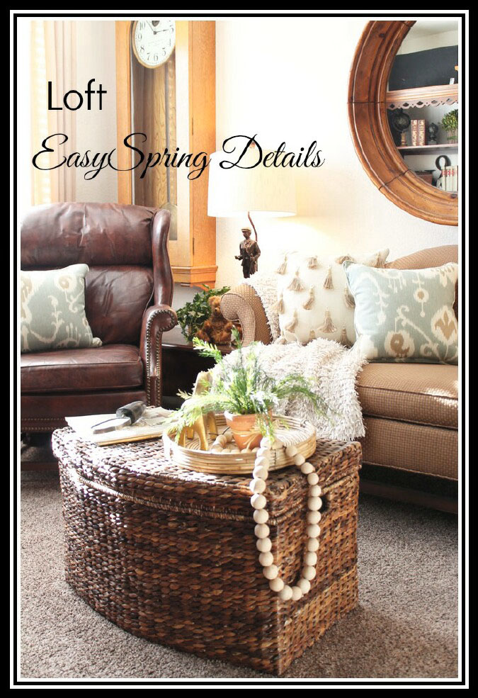 The Loft/Girl Cave is a great example of adding Pattern and Texture. This room has a great basket trunk that adds tons of texture even before I do any decorating. Adding a throw with tons of texture and a pillow with tassels amps up the texture quota tons. The pattern in the two pillows keeps it neutral but adds interest. Loft Easy Spring Details