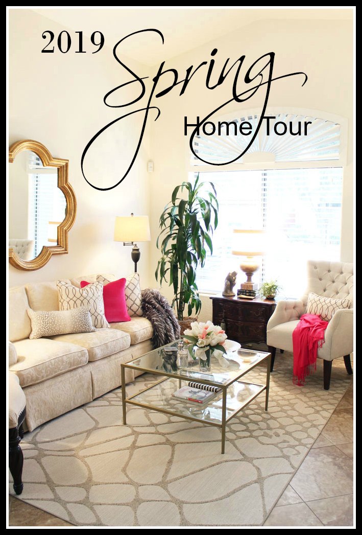 Bright pink takes this setting up a notch and so does the throw. The pillow on the chair and matching one on the sofa have sequins so in real life even more texture. 2019 Spring Home Tour