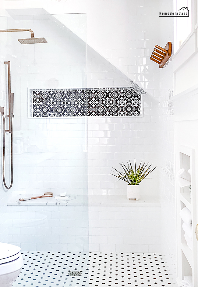 If you’ve ever wondered about Peel & Stick Tile, this is the article for you. Check out that gorgeous niche in the shower.