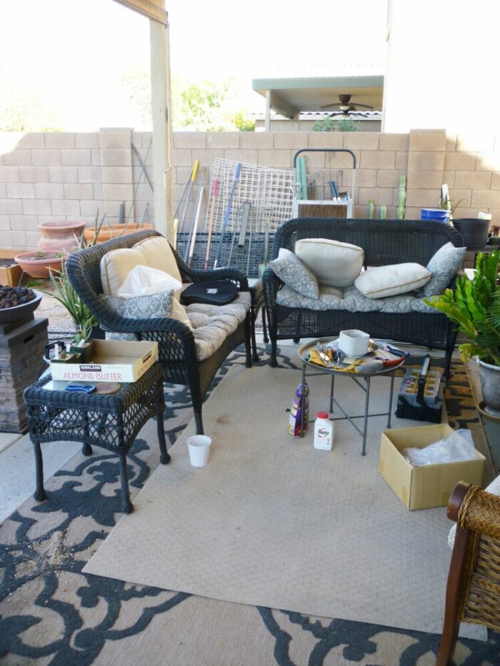 The patio didn’t get any love during the pool build, it just became the dumping ground for all the construction stuff.