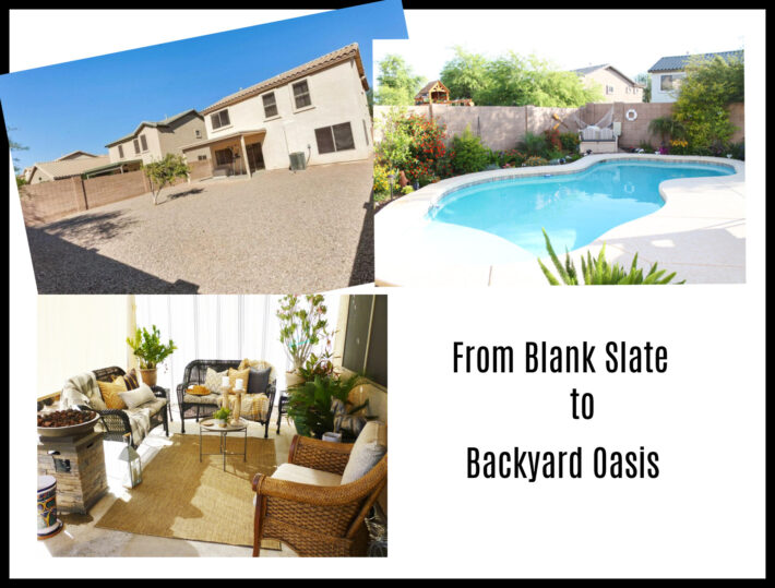 When we bought our new home it didn’t have anything in the backyard.  Talk about a blank slate, it was really bland.  Nothing but wall to wall gravel.  Not one single plant except a lone half dead tree.  We went from Blank Slate to Backyard Oasis in a few months.