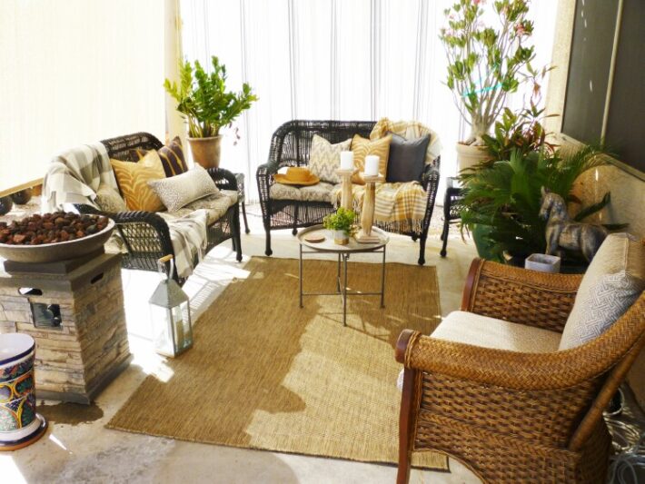 Now I had an enclosed room to decorate.  Rearranging our existing furniture, adding some plants and bringing a wicker chair outside gave me a new base to decorate.  I bought a new rug to anchor the space – 5 x 7 for $69 from At Home.  I replaced our old cushions with some gray and white ones from At Home for a total of $68.00.  Next a few pillows, throws and candles from my stash and we had a welcoming patio.  Total cost of the patio makeover – $237.00