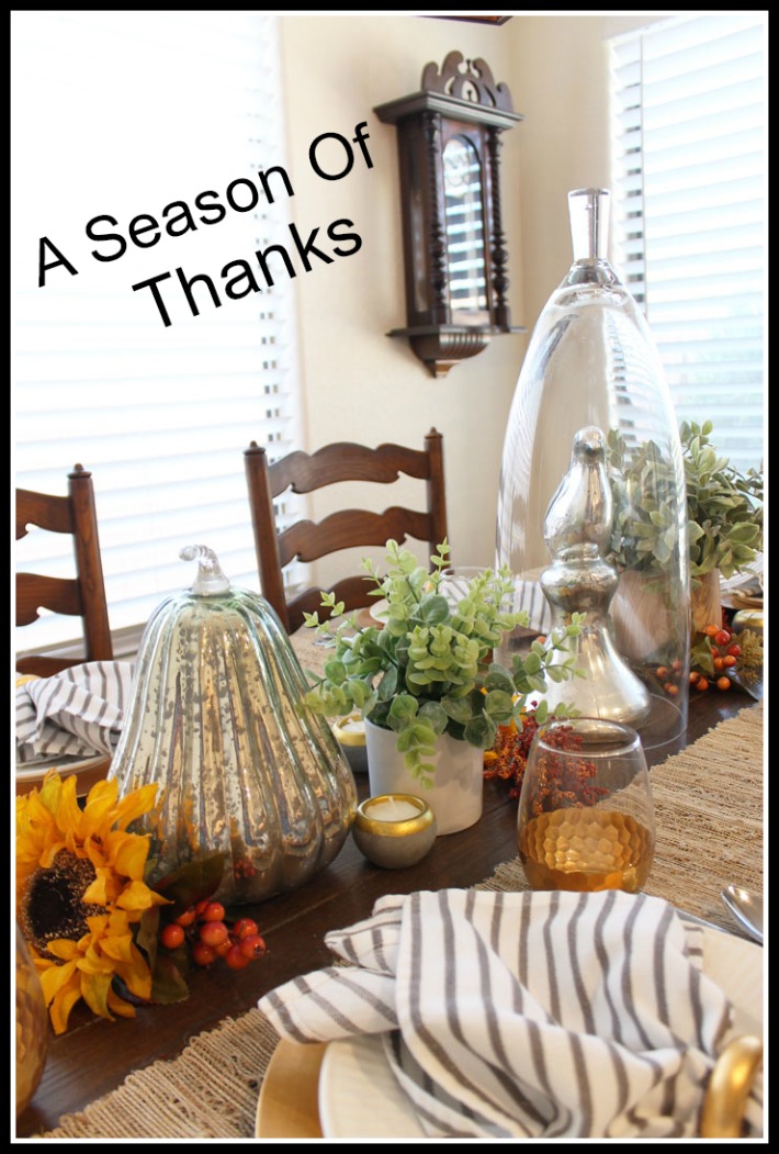 With Thanksgiving coming up really soon, I thought I better get my house in shape. I am thrilled that I will be having company for the Holiday, that always makes the day so much more special. Since we will be having most of our meals in the breakfast room I thought I should set a pretty everyday table for us. We will have our main Thanksgiving Dinner with all the family at my daughter’s. I kept the breakfast table simple for a Season Of Thanks.