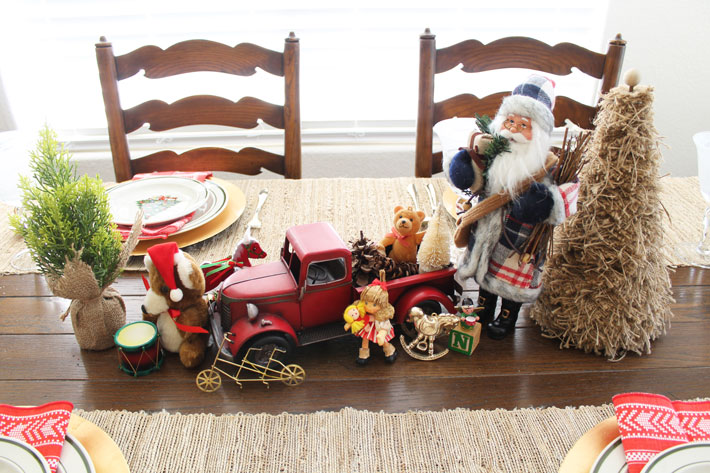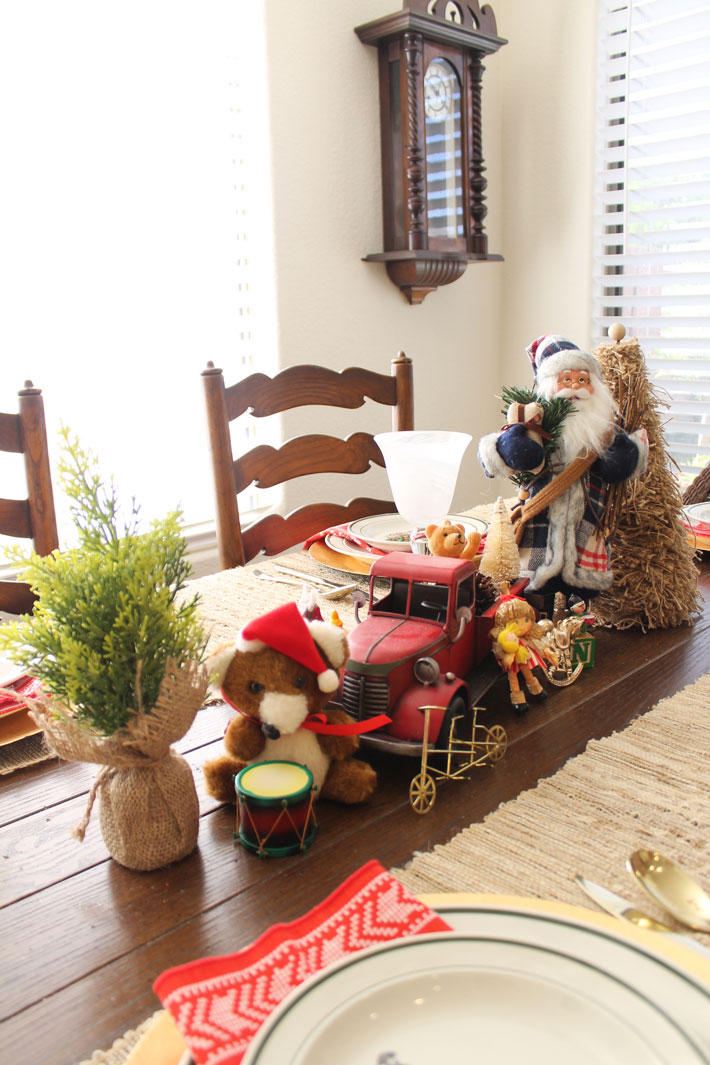 I love creating fun tablescapes and the Breakfast room is the best place to play. My farmhouse table is a favorite. A nice long space to create a fun centerpiece. This year I am creating a toyland table theme for the grands.