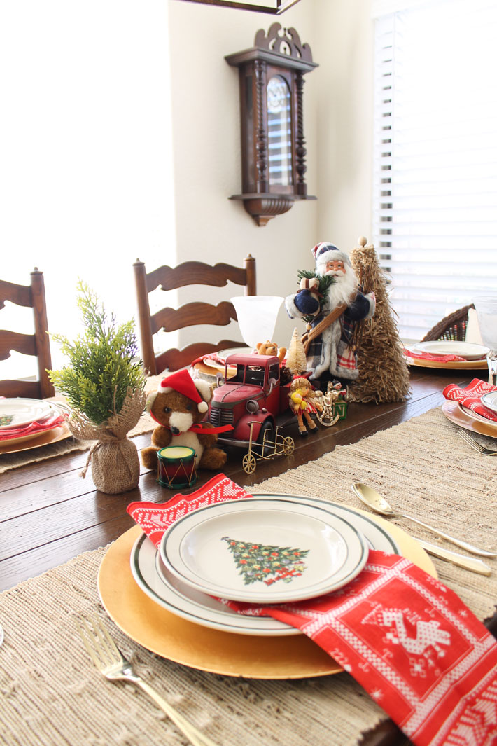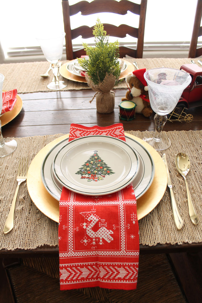 My Christmas Tree dishes are a fabulous find years ago and I love pulling them out each year. Fun Christmas napkins and gold flatware create a festive placesetting.