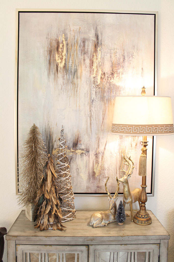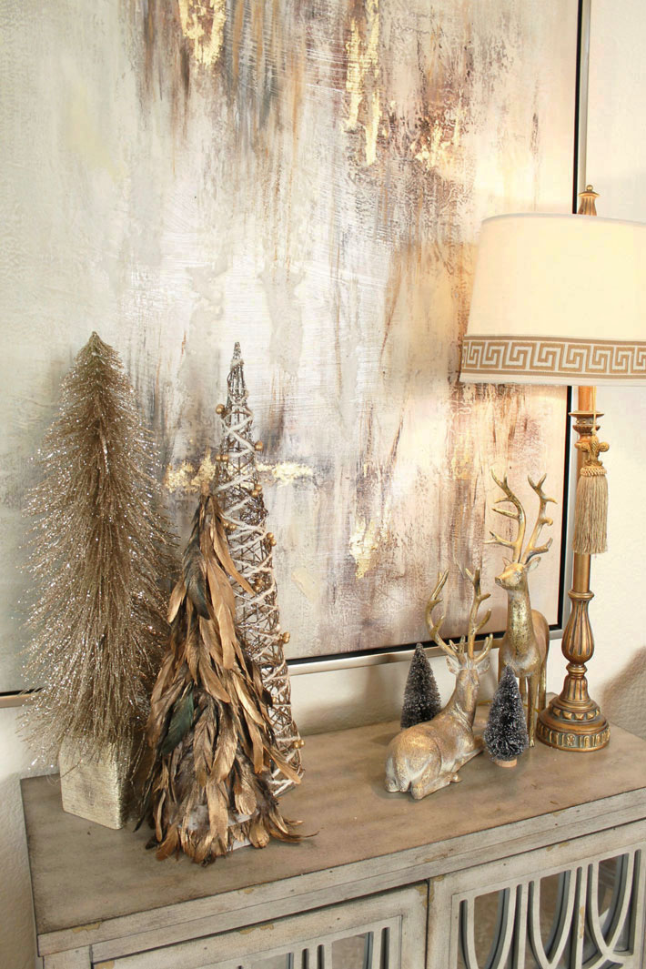 An assortment of gold trees and reindeer create an elegant Christmas vignette on top of the console.